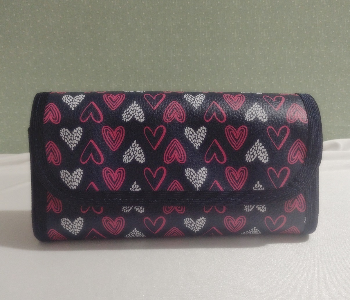 Necessaire, estojo em tecido com 2 bolsos plásticos e fechamento com zíper e uma bolsinha com zíper.