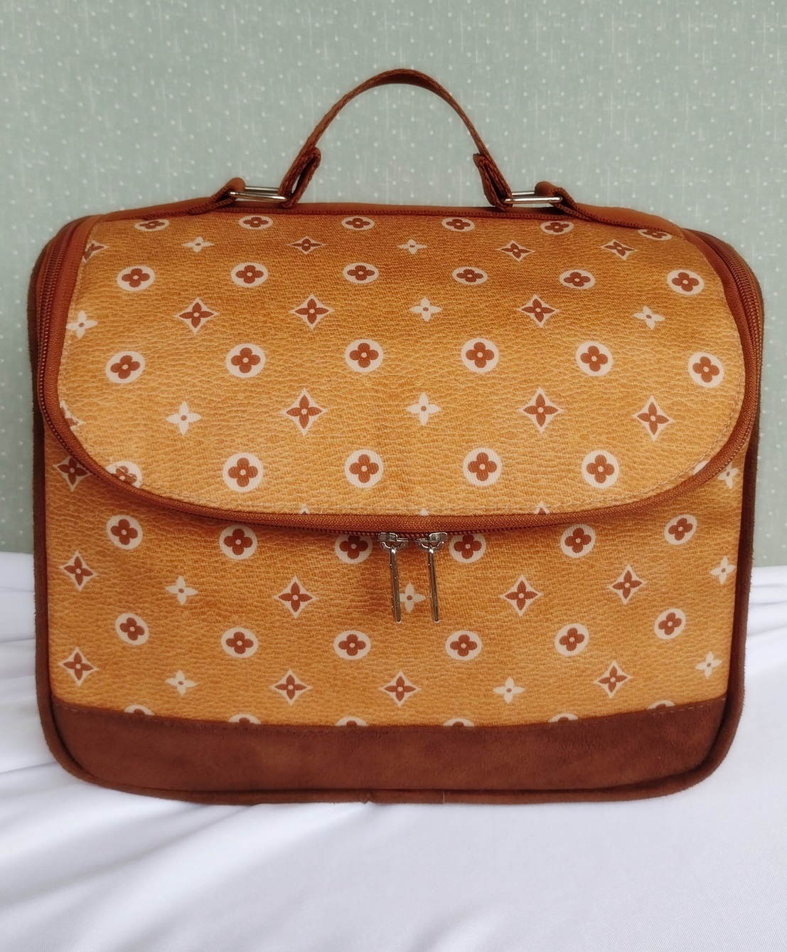 Uma frasqueira baú, com abertura total e com um bolso de tela e fechamento com ziper no interior da frasqueira. ela é bem espaçosa.