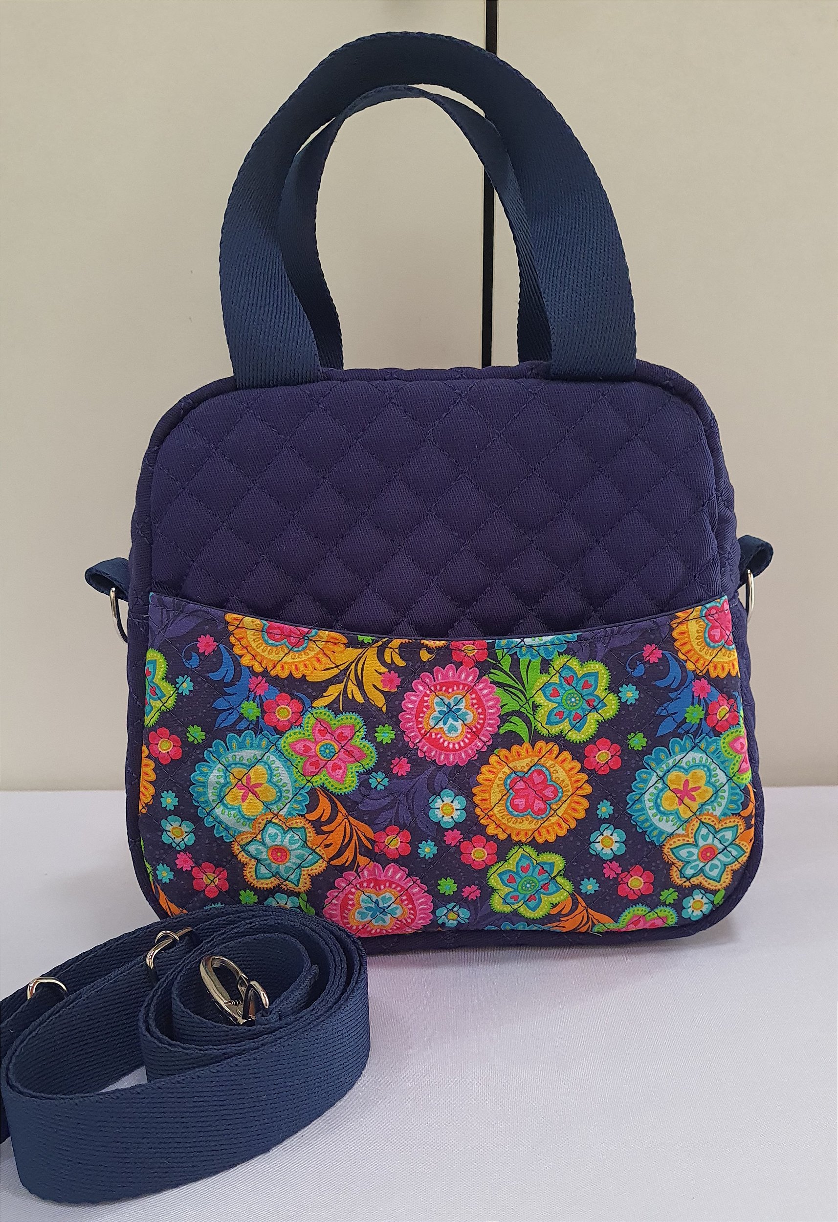 Lancheira térmica em tecido do lado externo, estruturada com manta térmica e forrada com material impermeável, bolso externo, alça de mão e alça transversal com regulagem.