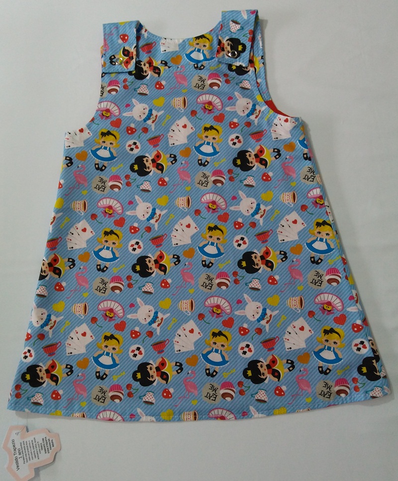 Vestidinho modelo trapézio, todo em tecido 100% algodão, tanto do lado de fora como do lado interno, seu fechamento e no ombro com botões de pressão nas alças, o comprimento do vestido e no joelho da criança. Pode ser usado dos dois lados, pois o interno é utilizado o mesmo tipo de tecido, um tecido com mesma qualidade do externo, 100% algodão, as costuras são todas embutidas. Nos tamanhos: RN ao 12 anos.